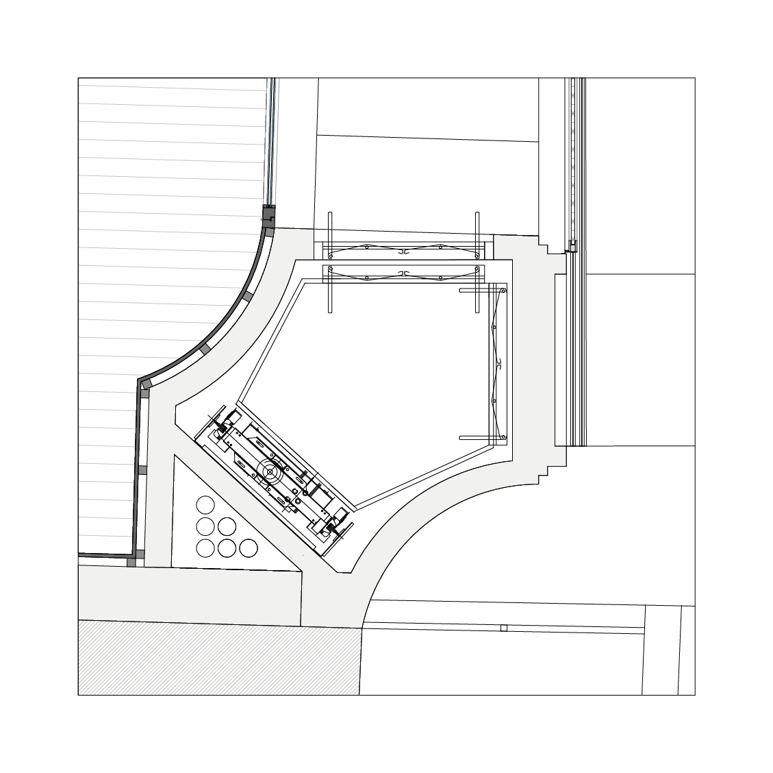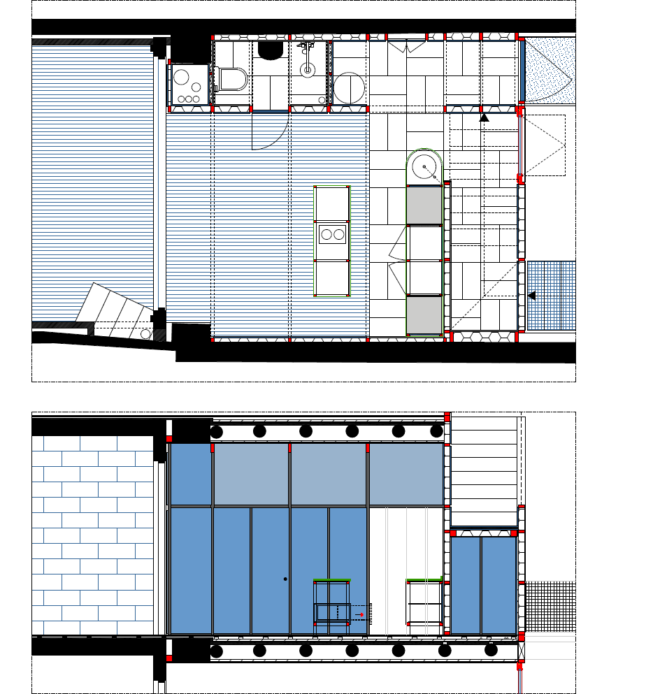 No piso 0, como já referimos, a situação encontrada era bem diferente, estando desprovido de qualquer elemento original, à excepção das paredes limítrofes em alvenaria de granito e o tecto com a estrutura do piso em madeira. Tudo o resto eram pobres intervenções de interior e caixilharias dos anos 80. Esta ausência permitia imaginar um espaço apenas, único, comum e público, espécie de “public house” aberta à rua sem reservas ou filtros criados por estruturas de compartimentação. Seria desenhar um espaço para o público, ou melhor, encontrar o desenho possível para uma divisória que dá forma aos dois principais espaços a prever: o do público e o de serviço, correspondente à cozinha. Dada a exigência de arrumação de stock e de diversas peças a acomodar, tornou-se impreterível que a divisória fosse também armário, que reuniria e organizaria todos os equipamentos e dispositivos necessários, desde o balcão ao banco fixo, dos viveiros à vitrina de bebidas. O espaço térreo é, não só onde o produto é mostrado, mas é também guardado, transformado, cozinhado, etc. O piso térreo é, por isso, o laboratório do todo. Esta parede-armário foi disposta tendo em conta o ângulo já existente entre as duas paredes das fachadas de alvenaria de granito, obtendo, assim, uma área razoável de cozinha e área de serviço no quadrante Sul/Nascente do edifício, sem perder a leitura de um espaçoúnico,comum,democráticonasuarelaçãocomarua. Aausênciadecarpintariasoriginaisoucom especial relevância, a agressividade associada ao uso de r/C e a necessidade de reforçar a estrutura de piso levou-nos a cingir o trabalho no piso 0 à serralharia.