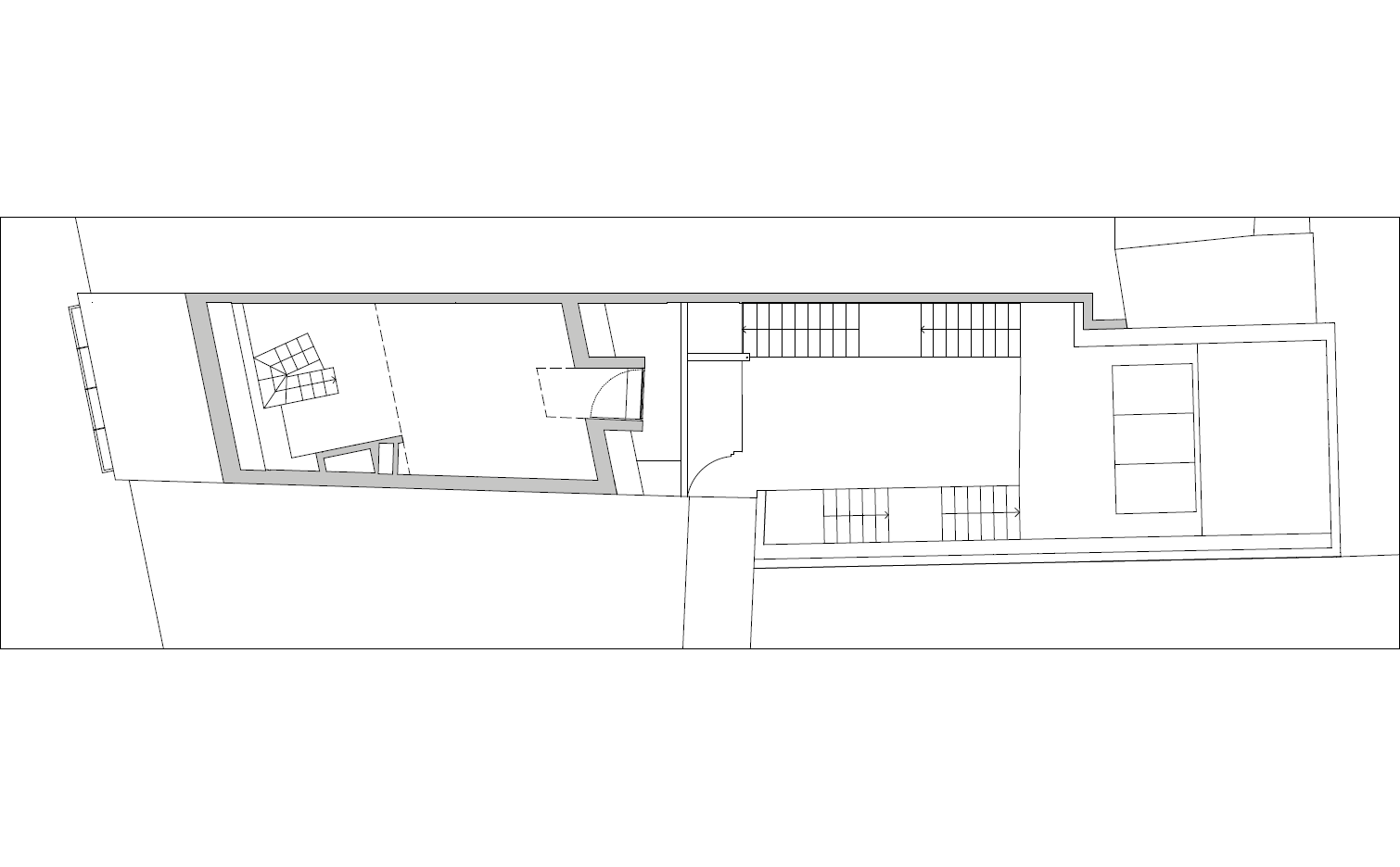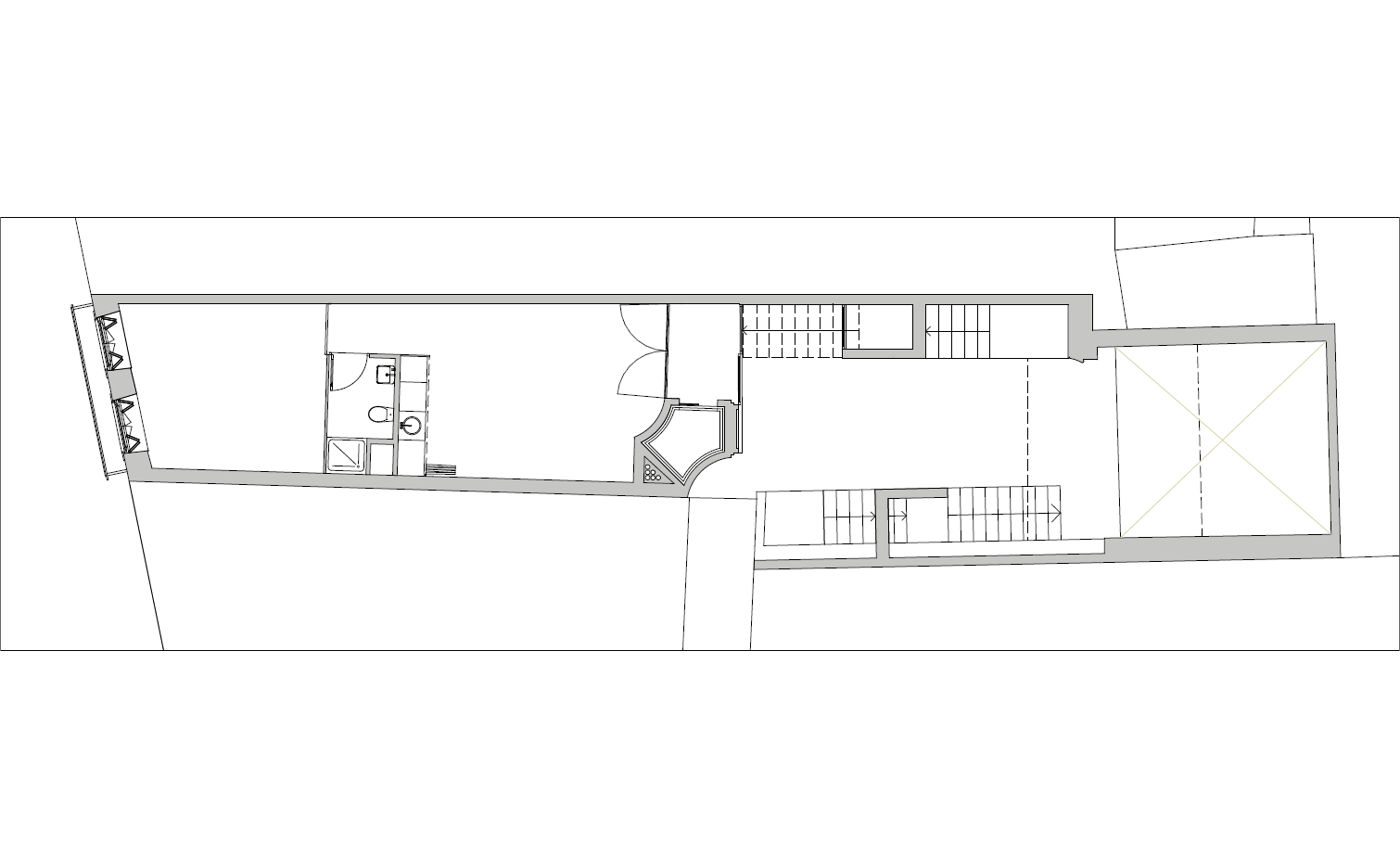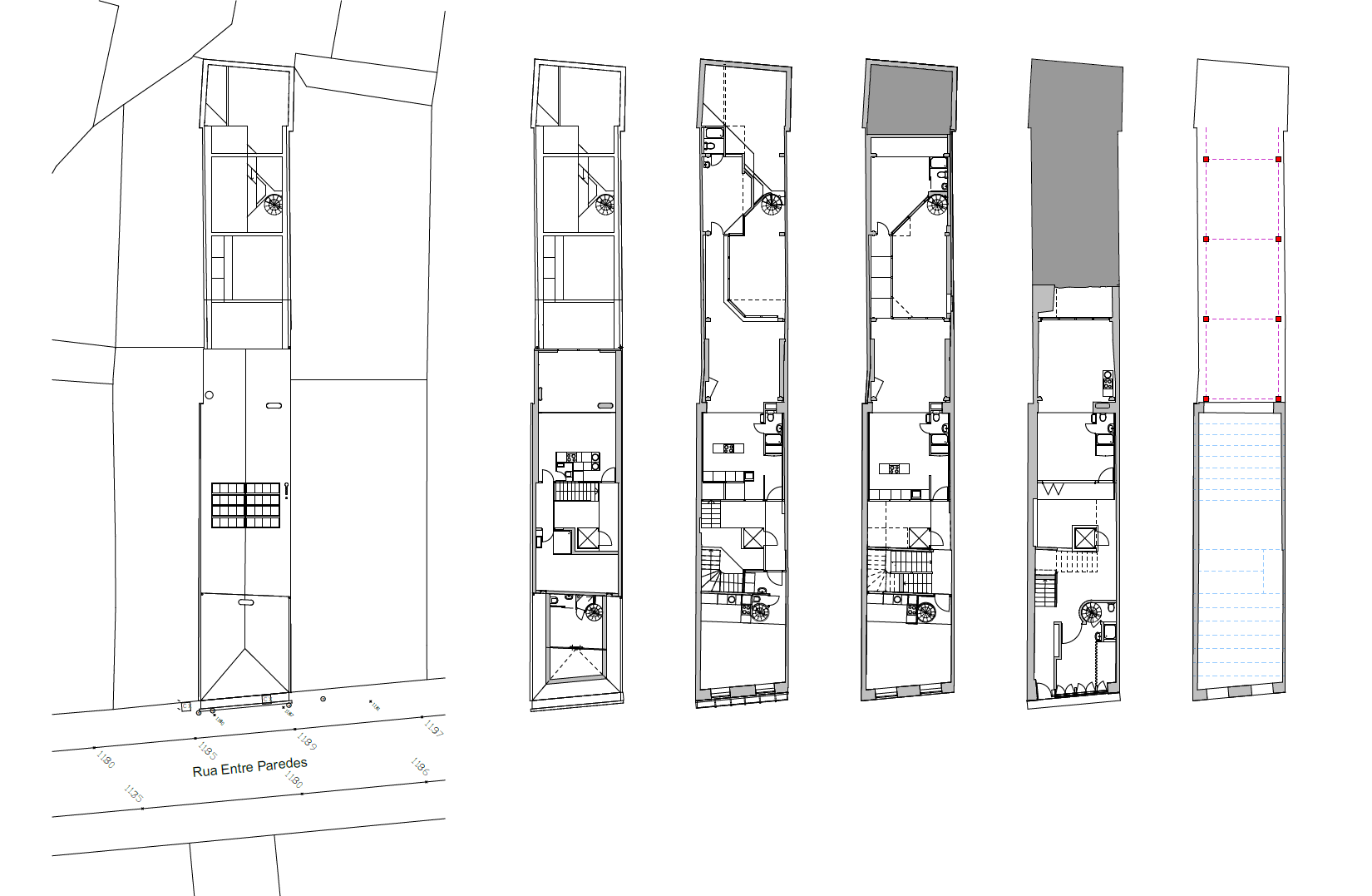 Quando visitamos pela primeira vez o prédio, já não havia prédio - apenas a fachada frontal com 3 pisos, que seria obrigatório manter. Era possível ter mais um piso e um sótão no desvão da cobertura. Pretendia-se instalar 3 fogos e um comércio no Rés do Chão. Apesar de extremamente estreito, o lote tinha duas entradas o que permitiu repensar o sistema de acessos, feito exclusivamente pelo exterior, como um “deambulatório” de escadas em redor do pátio comum do logradouro. O elevador em betão havia de estruturar o novo tardoz, sendo ele o único volume que se projecta além do alinhamento dominante de fachadas da Viela dos Poços, com recurso a uma planta pentagonal suavizada com curvas em dois dos seus lados - interior e exterior - que exigiam um remate mais delicado. Dada a fragmentação de plataformas a diferentes cotas e a sua articulação com as escadas implantadas no logradouro, não se pretendia construir uma fachada de tardoz formal. Por isso, a projecção do elevador é cosida apenas com painéis de ferro e vidro que formam um átrio/ marquise, espaço de transição para o interior de cada fogo. O prolongamento desse tipo de construção metálica às escadas exteriores, simplesmente apoiadas na antiga parede meeira, reforçam essa desmontagem absoluta de um plano marcado ou referência volumétrica do edifício original.