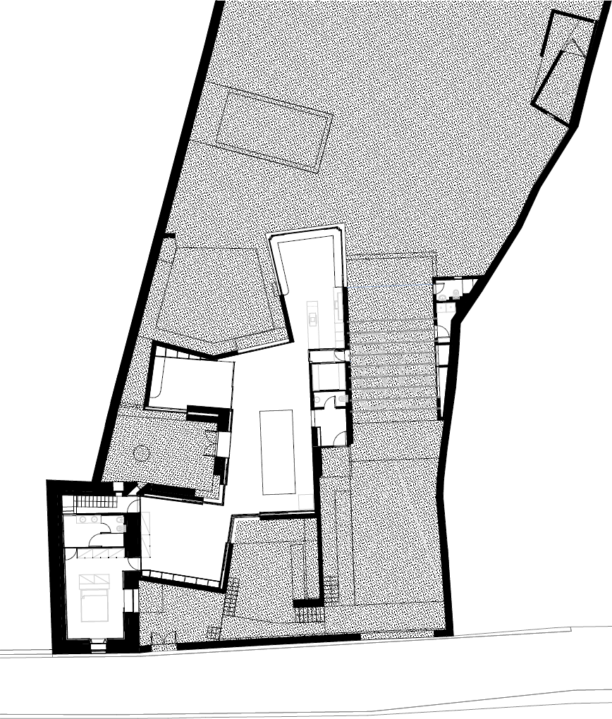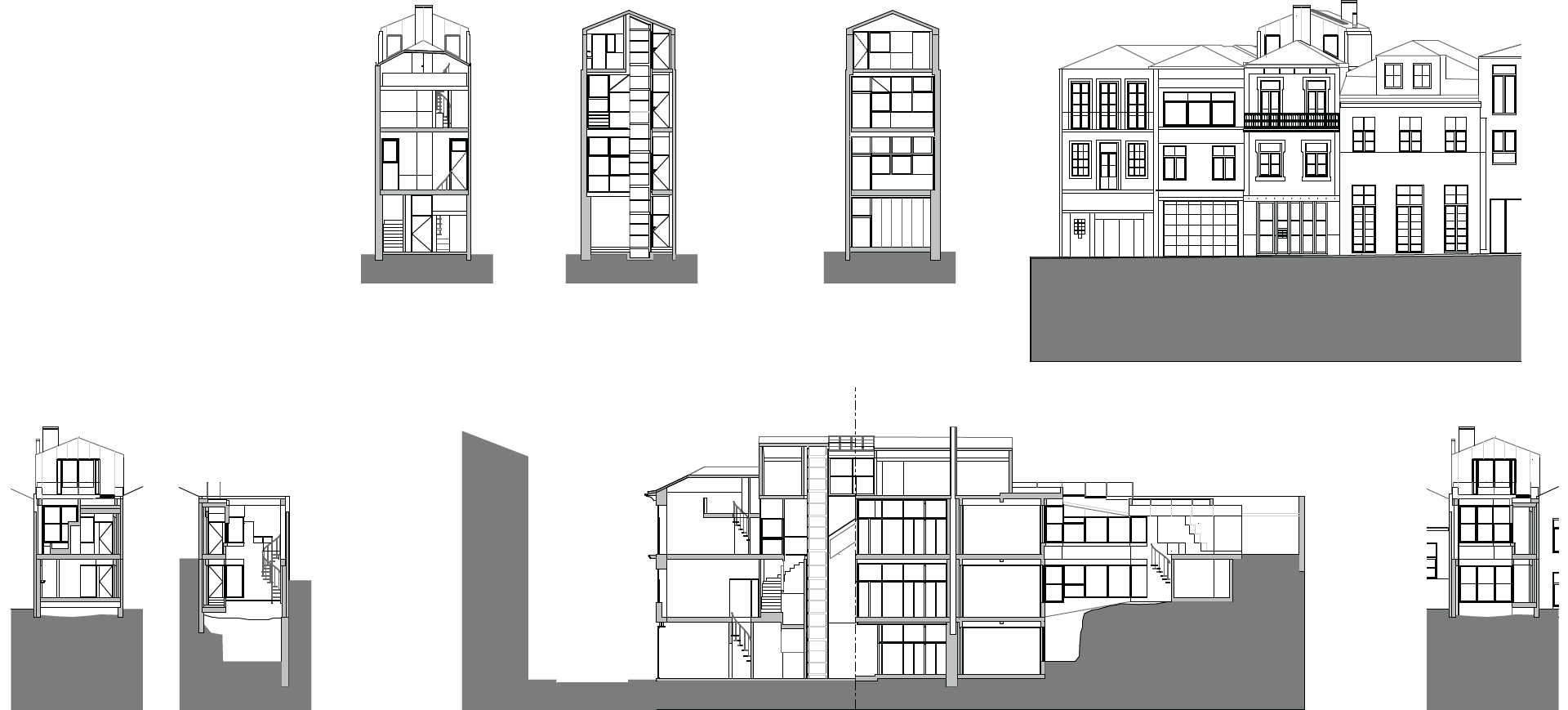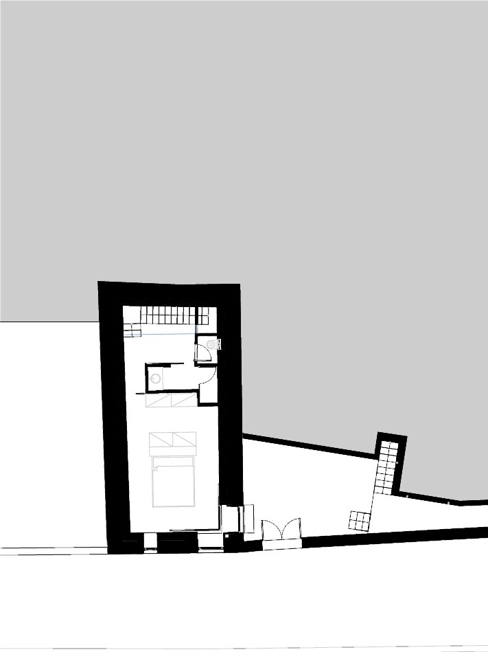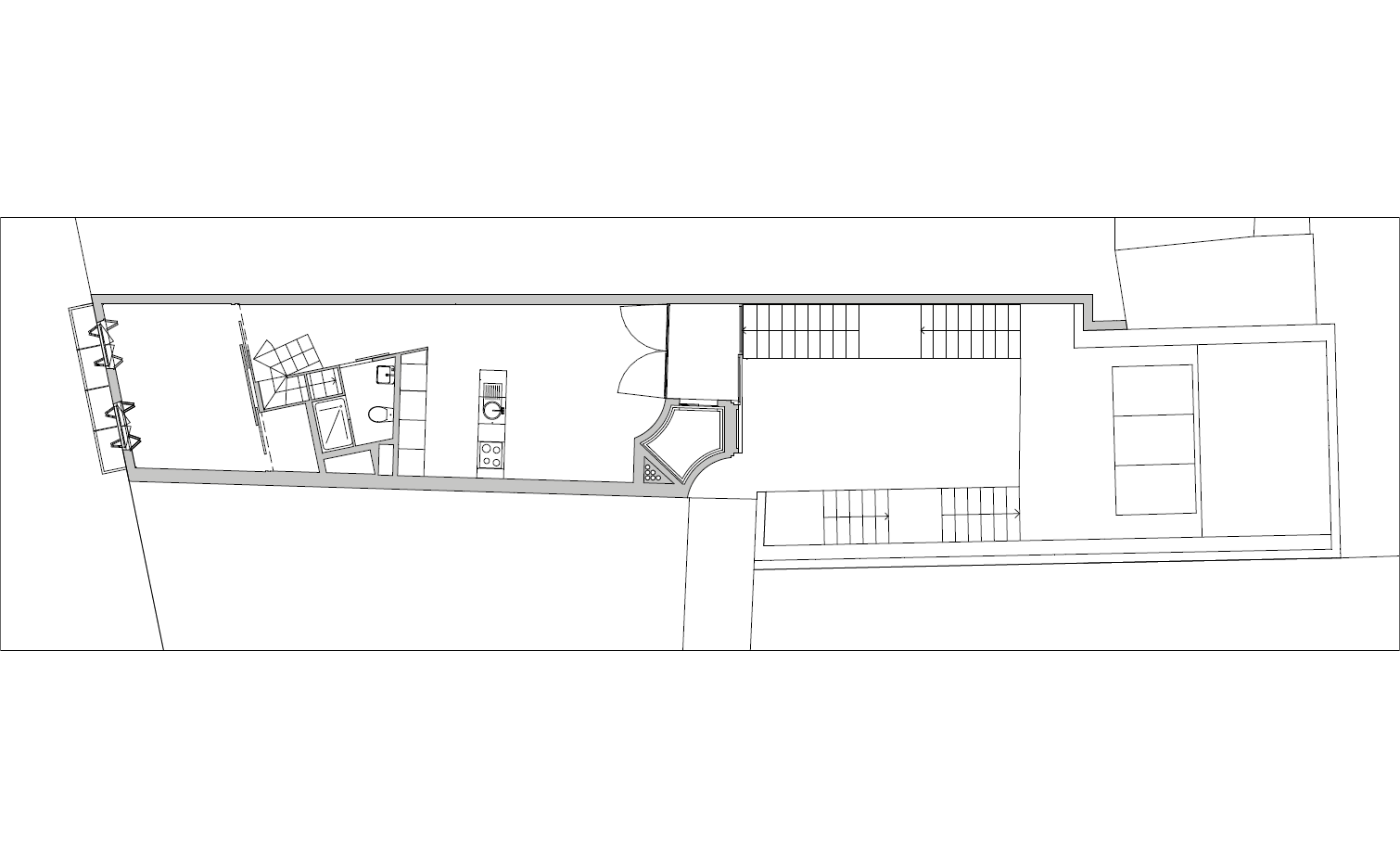 Quando visitamos pela primeira vez o prédio, já não havia prédio - apenas a fachada frontal com 3 pisos, que seria obrigatório manter. Era possível ter mais um piso e um sótão no desvão da cobertura. Pretendia-se instalar 3 fogos e um comércio no Rés do Chão. Apesar de extremamente estreito, o lote tinha duas entradas o que permitiu repensar o sistema de acessos, feito exclusivamente pelo exterior, como um “deambulatório” de escadas em redor do pátio comum do logradouro. O elevador em betão havia de estruturar o novo tardoz, sendo ele o único volume que se projecta além do alinhamento dominante de fachadas da Viela dos Poços, com recurso a uma planta pentagonal suavizada com curvas em dois dos seus lados - interior e exterior - que exigiam um remate mais delicado. Dada a fragmentação de plataformas a diferentes cotas e a sua articulação com as escadas implantadas no logradouro, não se pretendia construir uma fachada de tardoz formal. Por isso, a projecção do elevador é cosida apenas com painéis de ferro e vidro que formam um átrio/ marquise, espaço de transição para o interior de cada fogo. O prolongamento desse tipo de construção metálica às escadas exteriores, simplesmente apoiadas na antiga parede meeira, reforçam essa desmontagem absoluta de um plano marcado ou referência volumétrica do edifício original.