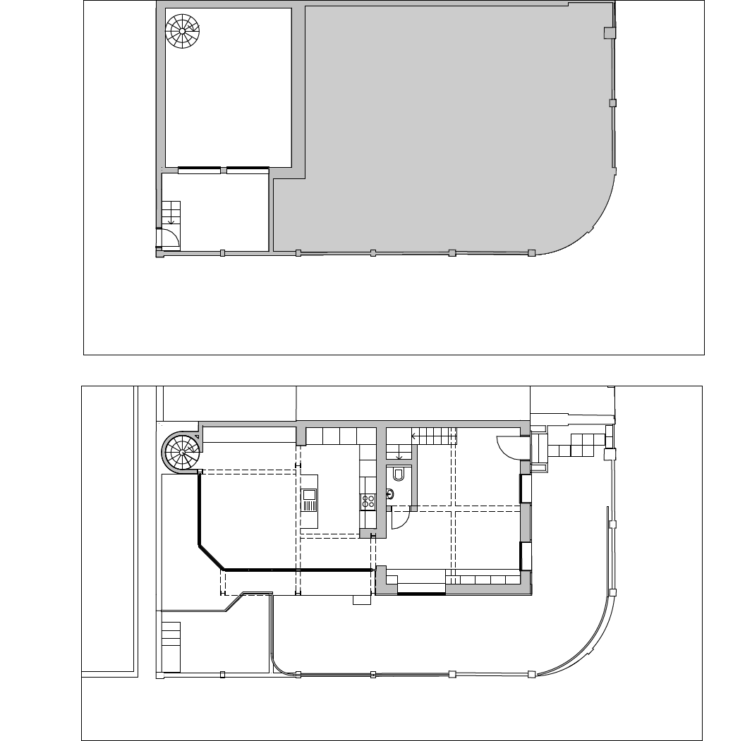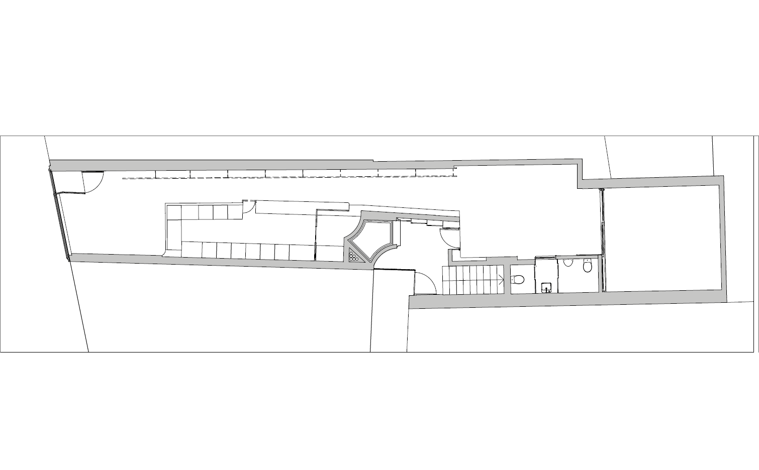 A proposta de programa que nos foi apresentada era clara e assentou nesta dualidade entre os pisos: deveriam funcionar, em simultâneo, uma espécie de “oyster bar” e um espaço de restaurante, mais formal, servidos pela mesma cozinha. Deveriam ser partes distintas da mesma unidade. Para não perverter o sistema intemporal de uso autónomo por piso – que poderia ser reposto no futuro – evitou-se a construção de uma escada directa entre pisos. Preferiu-se o uso da escada existente e a transformação do seu espaço,