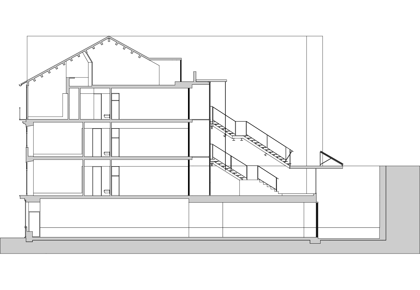 No antigo logradouro, as paredes meeiras não tinham a mesma qualidade, pelo que optámos por uma estrutura de betão com lajes colaborantes, seguindo uma métrica que permitia coser os principais elementos, incluindo a escada existente. A partir daí, o jogo passou a ser o de adicionar escadas, varandas, elevador, nichos, todos arrumados segundo uma métrica principal de 1,2 m, que dividia o prédio em quatro partes iguais na sua largura. Tudo para que a casa burguesa e a fábrica pudessem dar lugar à habitação colectiva com o mínimo de esforço supérfluo.