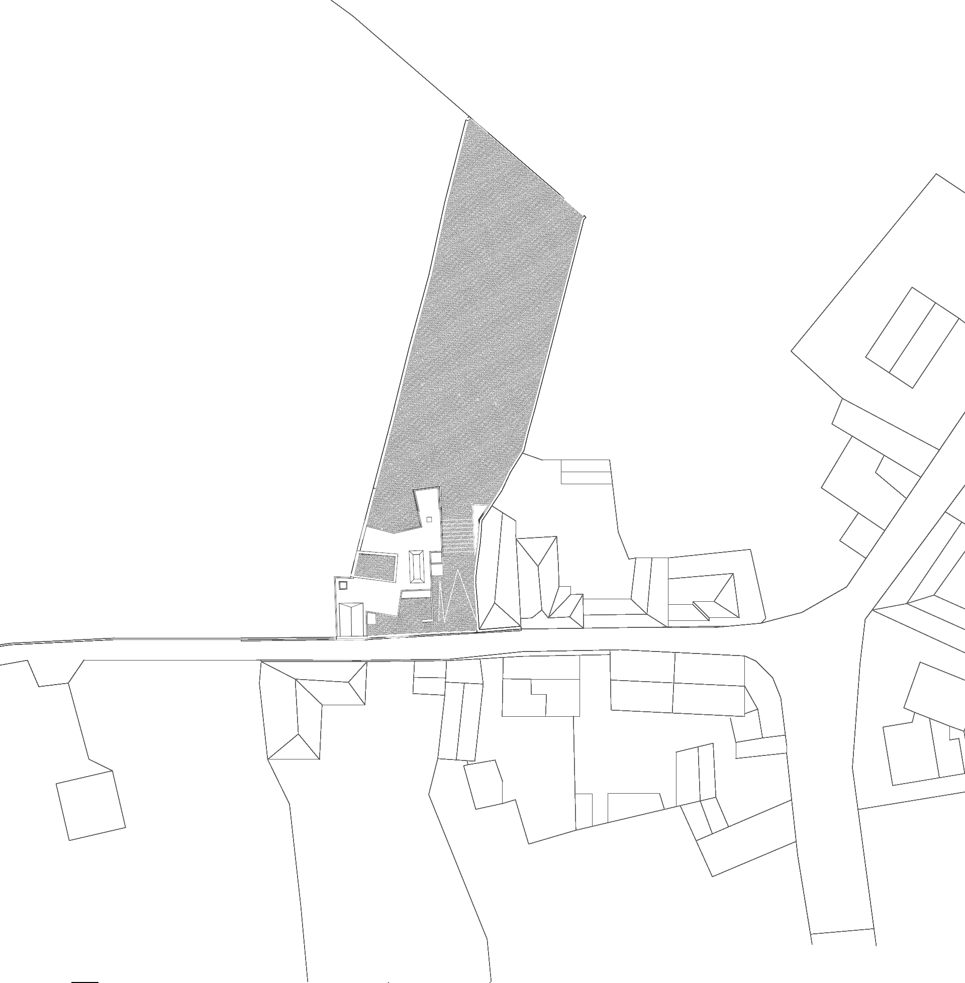 A peça surge oblíqua e desagrupada no meio de um vazio formado por planos de fachadas de edifícios de apoio em chapa e um muro de vedação.