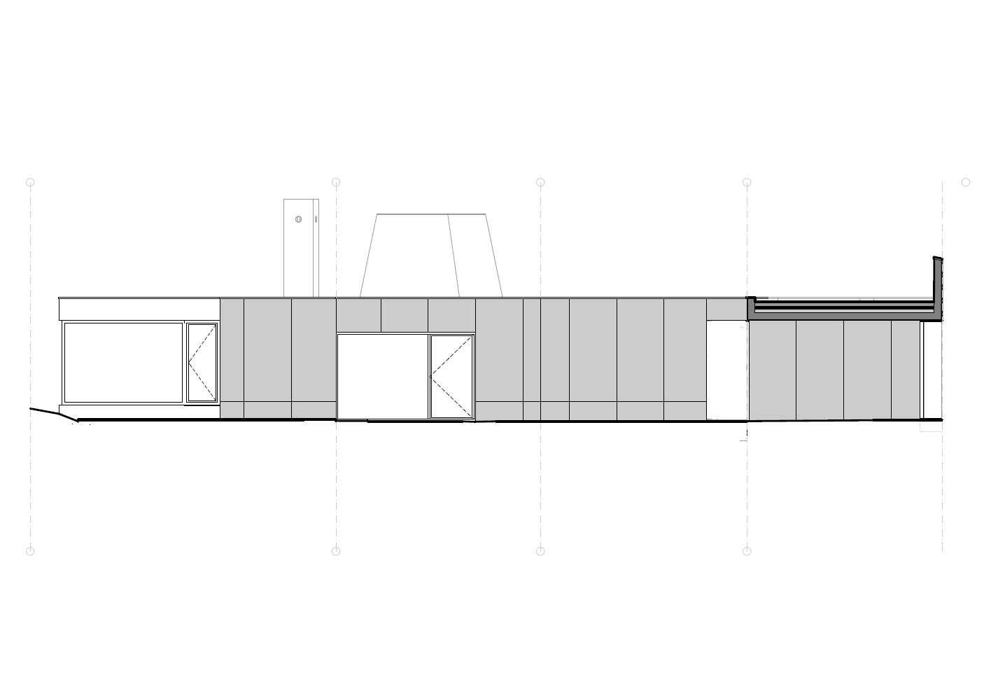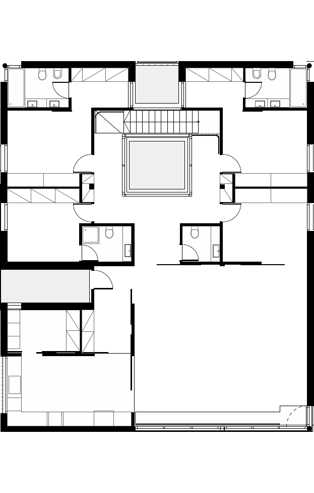 Ao ponto de terem ocupado, a certa altura, o segundo quarto com armários próprios de guarda-roupa. Todos estes indícios, somados ao desenho existente - bastante típico de um financiado por construtor dos anos 90 - sem cuidados na qualidade da compartimentação e do seu resultado espacial, levou-nos à revisão quase total dos espaços, na relação com a aplicação real dos hábitos, discutida de raiz. A habitação não poderia deixar de ser compartimentada mas poderia adquirir diferentes categorias de divisão, em que cada umbral correspondesse a um grau de aprofundamento da intimidade e, por isso, de relação entre os espaços que mediava. Primeiro, ficou o registo de um corte excessivo da relação entre o cônjuge que usava a sala e o outro que usava o escritório quando se encontravam em casa, já de noite, pela presença da cozinha, colocada entre estes