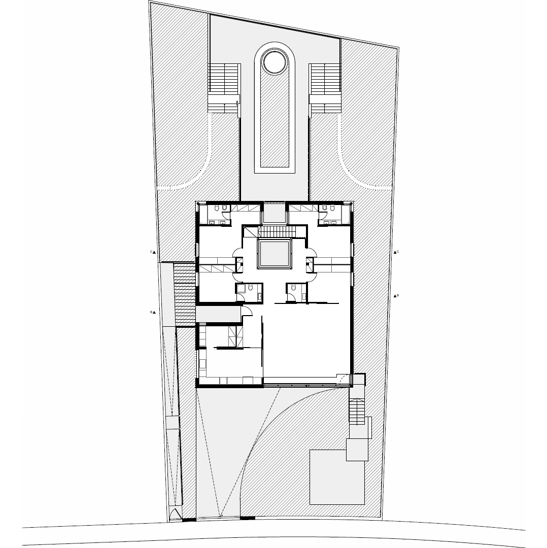 Nesse intento, juntaram-se dois “projectos” com os modos de hoje e daqui: a planta da Casa Sul Mare di Sicilia de Lina Bo Bardi e Carlo Pagani, nada estranha tipologicamente à Domus Romana, e o dominó corbusiano, extremado no corte que eleva o piano nobile da Casa, “aumentando” o terreno de um lote suburbano não muito extenso. Os modos: ao dominó de betão justapusemos, no piso superior, uma fachada de ETICS com um entablamento, sob o qual fenestrámos o volume nos seus 4 lados. A excepção reservou-se para a entrada que corta esse entablamento. As caixilharias de alumínio são expostas à cor natural, assim como o contraplacado de madeira e o mármore no interior.