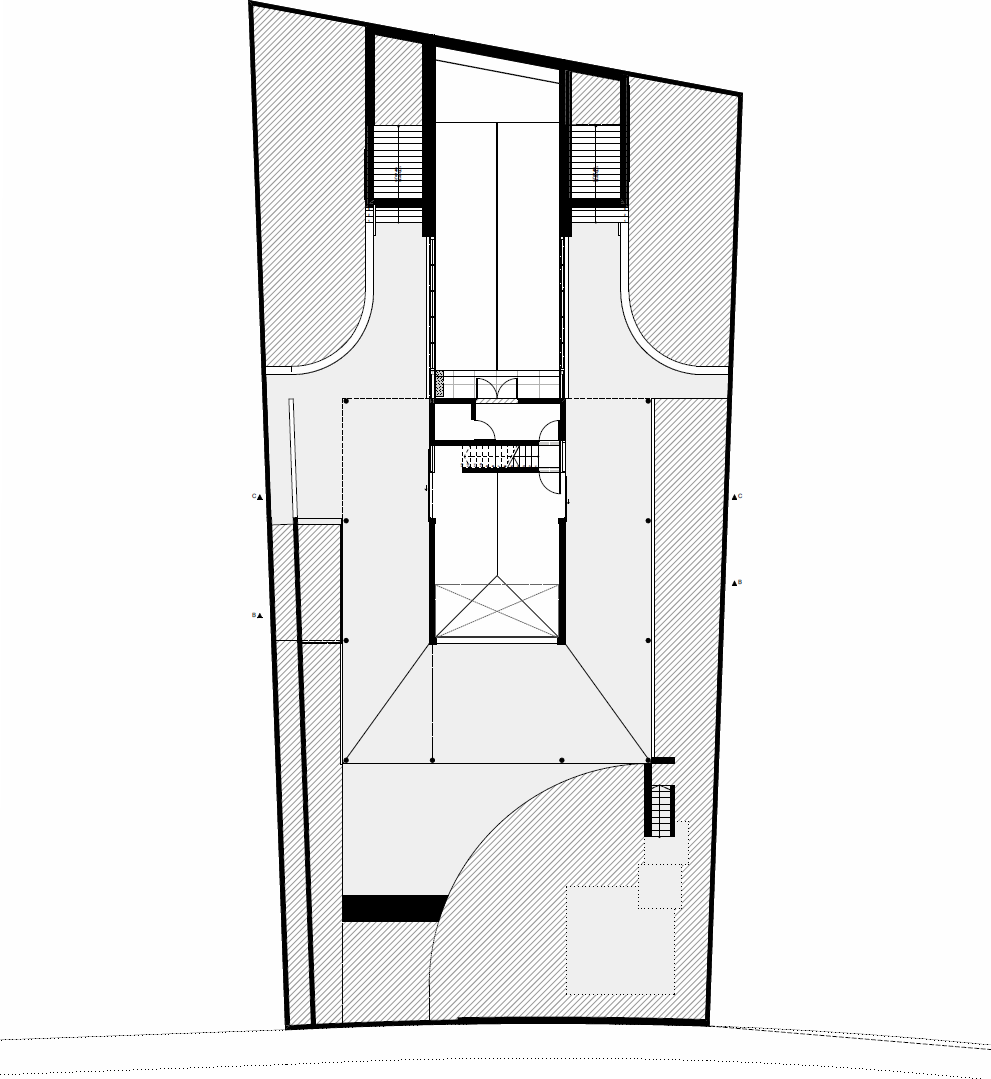 Ao contrário dos apartamentos, que são “boxes” estanques, e que conduzem o espaço entre eles sempre na vertical, rematando numa grande claraboia, o escritório funciona no piso térreo como extensão do átrio, com remate visual num grande rochedo, iluminado difusamente.